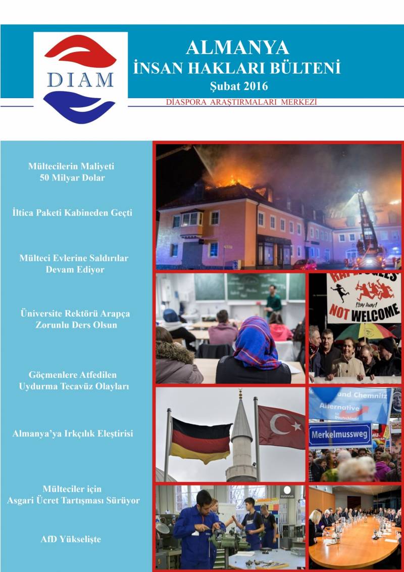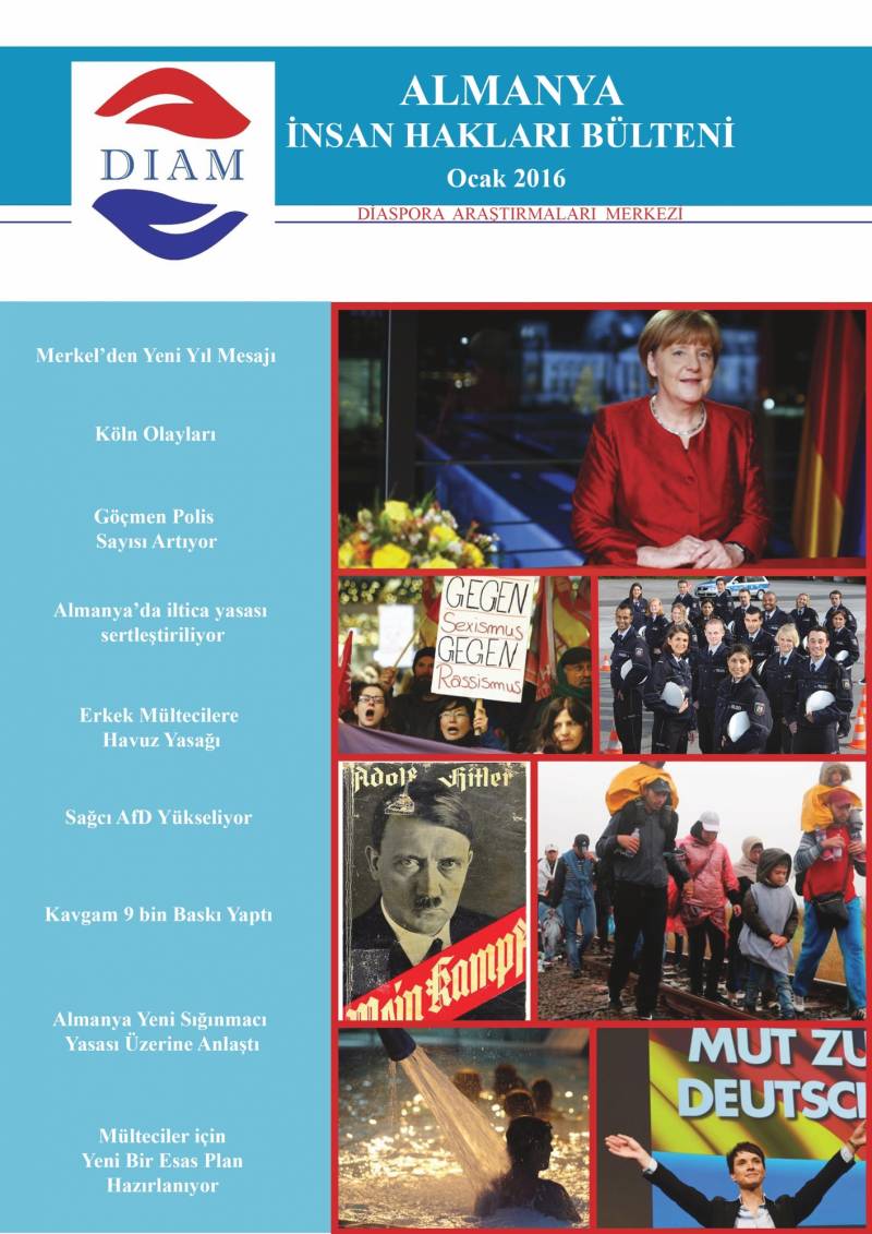 Sakarya Üniversitesi Diaspora Araştırmaları Merkezi’nce hazırlanan Almanya 2016 (Ocak-Şubat-Mart) Bülteni yayınlandı. Yayınlanan bu bültenlerde 2016 yılının her ayında Almanya’da yaşanan olaylara ilişkin haber içerikleri bulunmaktadır. Gün gün takibi yapılan Türkçe, Almanca ve İngilizce kaynaklardan derlenen Almanya 2016 Hak ve Özgürlükler Bülteni, Almanya’ya ilişkin yaşanan gelişmelere DİAM araştırmaları bağlamında odaklanmaktadır.