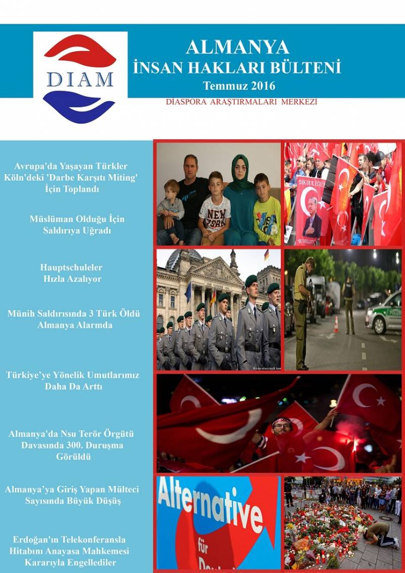 Sakarya Üniversitesi Diaspora Araştırmaları Merkezi’nce hazırlanan Almanya 2016 Temmuz Bülteni yayınlandı. Yayınlanan bültende 2016 yılının Temmuz ayında Almanya’da yaşanan olaylara ilişkin haber içerikleri bulunmaktadır. Gün gün takibi yapılan Türkçe, Almanca ve İngilizce kaynaklardan derlenen Almanya 2016 Hak ve Özgürlükler Temmuz Bülteni, Almanya’ya ilişkin yaşanan gelişmelere DİAM araştırmaları bağlamında odaklanmaktadır.