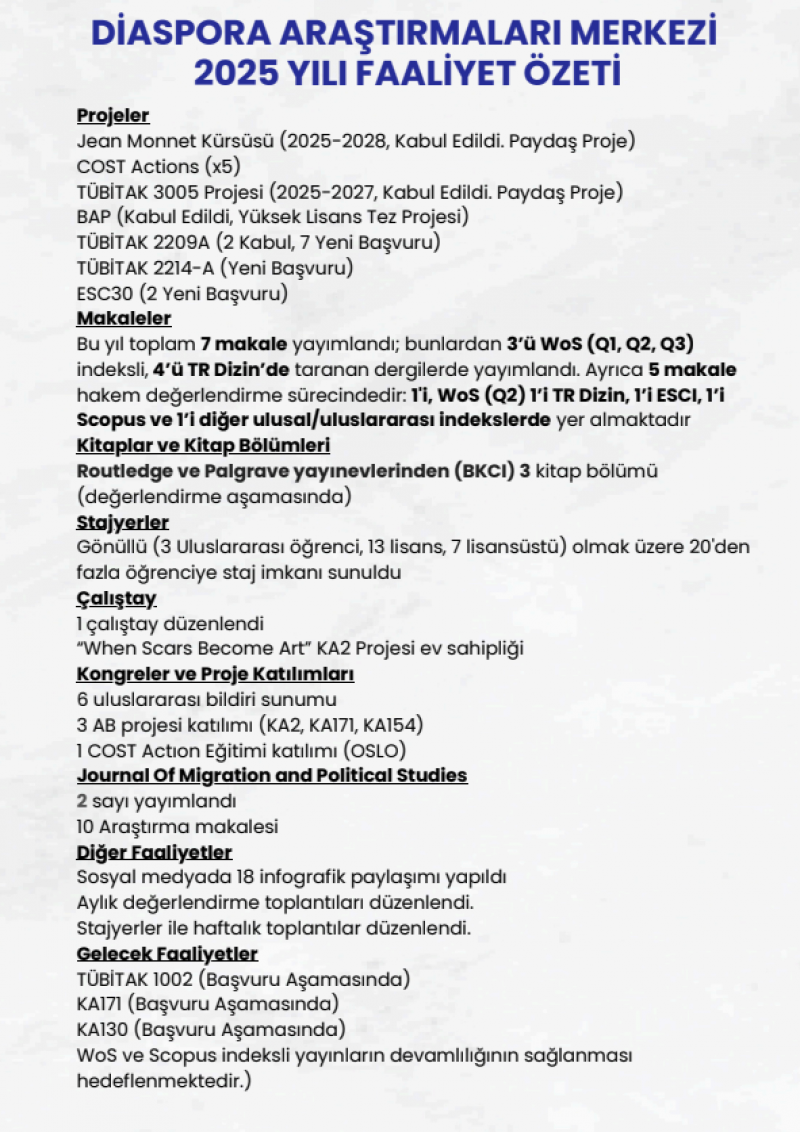 Diaspora Araştırmaları Merkezi (DİAM) olarak 2025 yılı içerisinde biri kabul edilmiş paydaş proje olmak üzere Jean Monnet Kürsüsü (2025–2028) projesinde yer alınmış, ayrıca beş farklı COST Action ağına katılım sağlanmıştır. 2025–2027 dönemini kapsayan bir TÜBİTAK 3005 projesi paydaş olarak kabul edilmiş, bir BAP Yüksek Lisans Tez Projesi destek almaya hak kazanmıştır. Bunun yanında iki TÜBİTAK 2209-A projesi kabul edilmiş, yedi yeni 2209-A başvurusu yapılmış; bir TÜBİTAK 2214-A ve iki ESC30 projesi için başvuruda bulunulmuştur.